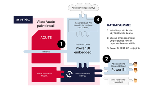 Valitessaan valmiit raportit (kuva 2, vaihe 1), asiakas pääsee suoraan kiinni raportointiin jo valmiiksi tutussa Acute-ympäristössä. Viteciläiset perehdyttävät asiakkaille raportoinnin perusasiat, ja koko henkilöstö pääsee hyödyntämään raportoinnin tietoja. Tällöin hyödynnetään Power BI Embedded -raportointia Acuten käyttöliittymän kautta.