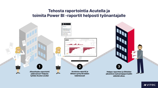Power BI -raportointi auttaa kehittämään yrityksen liiketoimintaa tuottamalla helposti ymmärrettävää ja visualisoitua tietoa. Acutessa tarjolla olevat valmiit Power BI -raportit on kehitetty etenkin työterveysasiakkaiden tarpeisiin, mutta ne palvelevat myös muita Acute-käyttäjiä.