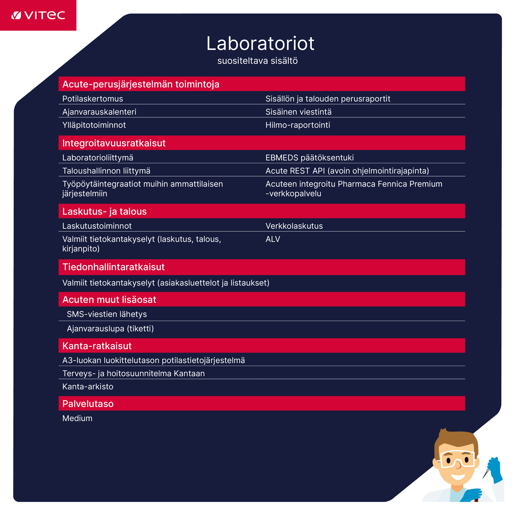 Acute-potilastietojärjestelmä on hyödyllinen alusta myös koulutus- ja tutkimuskäyttöön ja pohjaksi moniin muihinkin tarkoituksiin sekä hyvinvointialueille. Esimerkiksi tutkimuslaitokset tai tutkimuslaboratoriot, joilla on velvoite arkistoida tietoja Kanta-arkistoon, voivat hyötyä Acutesta. Laajentuva digiklinikka muovautuu juuri sinun tarpeisiisi sopivaksi. Järjestelmä toimii erinomaisesti myös terveydenhuollon opetuskäytössä, sillä järjestelmässä opettajan on mahdollista hyväksyä opiskelijoiden kirjaukset ennen niiden siirtoa Kanta-palveluihin.