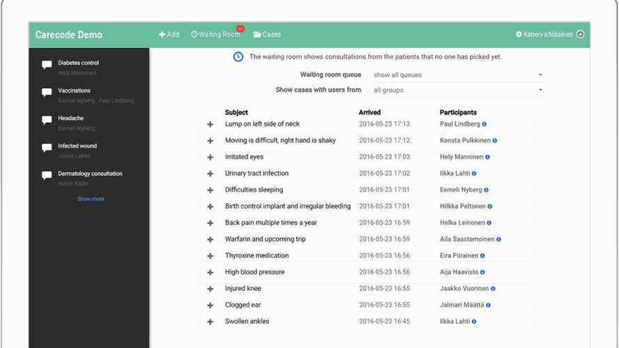 Carecode on pilvipohjainen kommunikaatiopalvelu sosiaali- ja terveydenhuoltoon. Se mahdollistaa sujuvan ja tietoturvallisen viestinnän lääkäreiden, hoitajien ja potilaiden välillä. Palvelu on helppo ja nopea ottaa käyttöön. Ohjelmisto on selainpohjainen ja se toimii ilman asennusta lähes kaikilla laitteilla, mukaan lukien mobiililaitteet. Se helpottaa ja tehostaa ammattilaisten arkea ja lisää asiakastyytyväisyyttä.