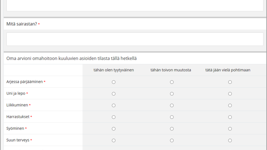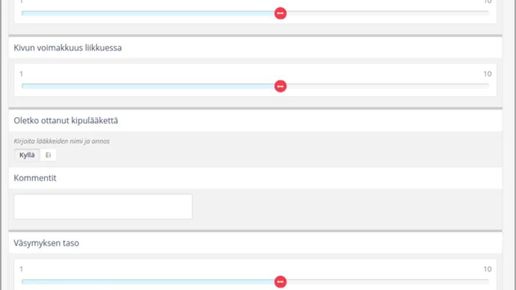 Moduuli tukee eri kyselytyyppejä (esimerkiksi asteikot, liukujana (VAS), radionapit), jokaiseen kysymykseen voidaan liittää ohjaustekstejä.