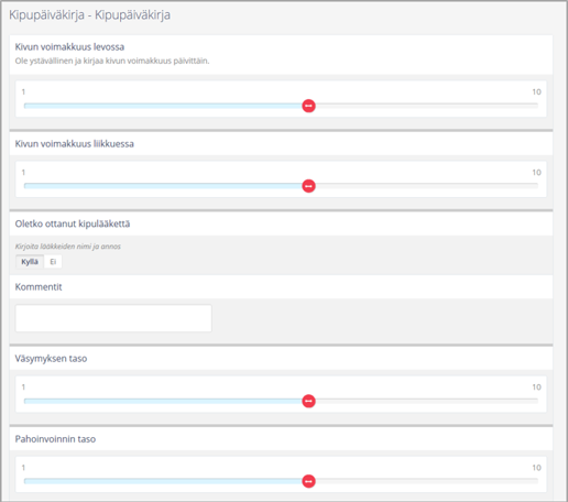 Moduuli tukee eri kyselytyyppejä (esimerkiksi asteikot, liukujana (VAS), radionapit), jokaiseen kysymykseen voidaan liittää ohjaustekstejä.